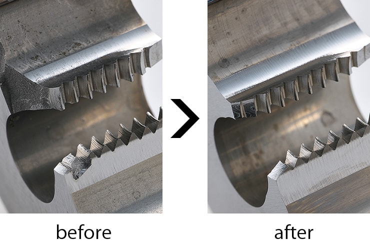 その際には、再研磨のご依頼頂ければ、ダイス切れ刃部分の摩耗を再研磨する事で、新品同等の切れに工具をよみがえらせます。